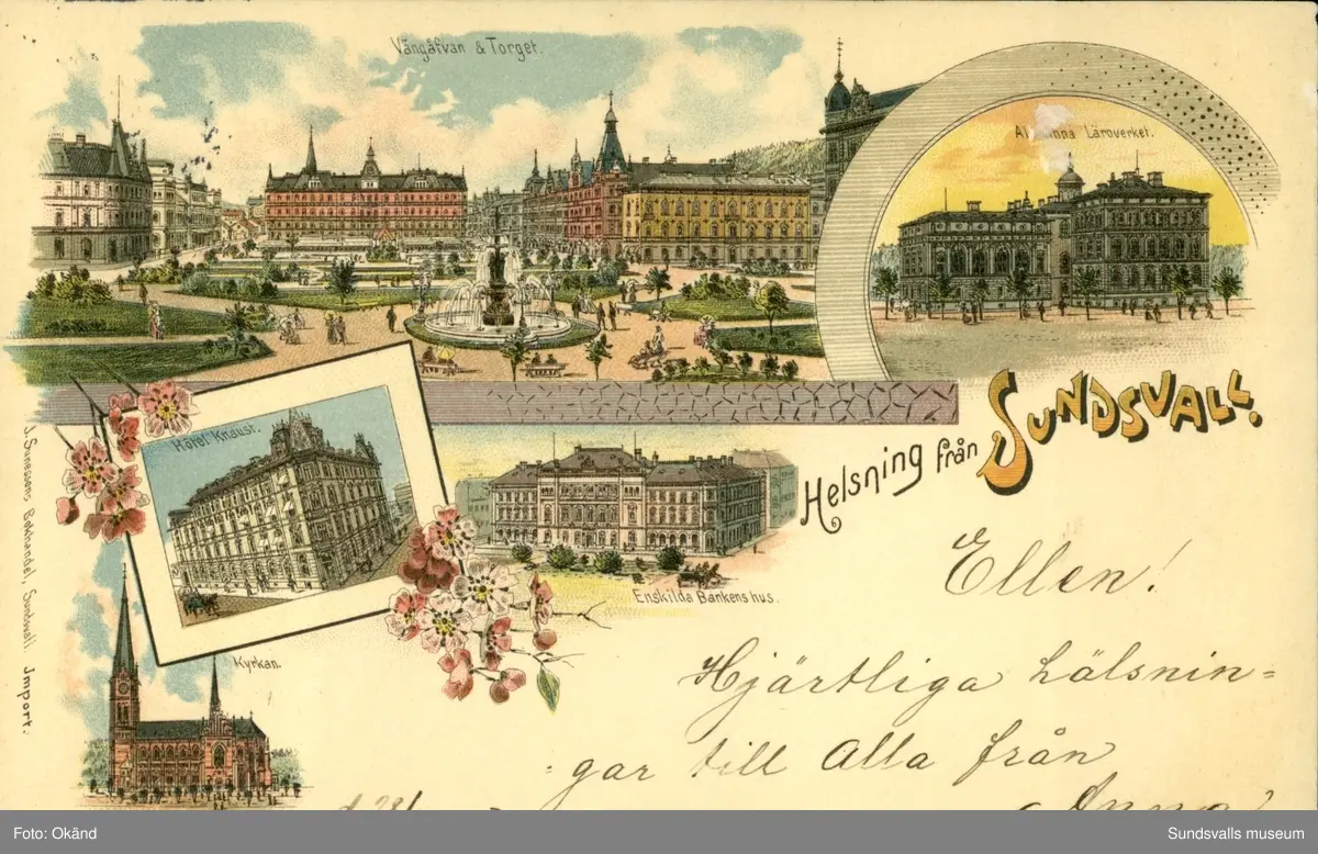 Vykort med motiv över Vängåvan, Stora torget, Allmänna läroverket, Hotell Knaust, Enskilda banken och Kyrkan i Sundsvall.