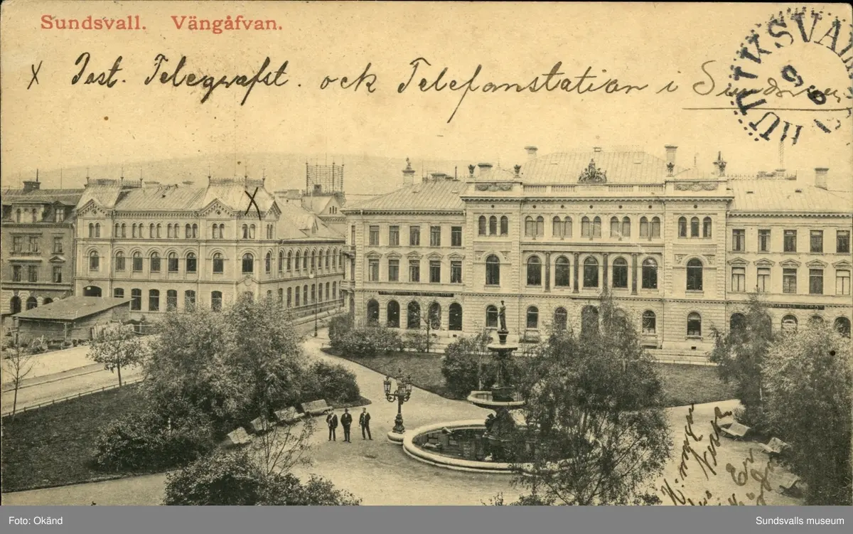 Vykort med motiv över Vängåvan, bankhuset och telegrafstationen i Sundsvall.