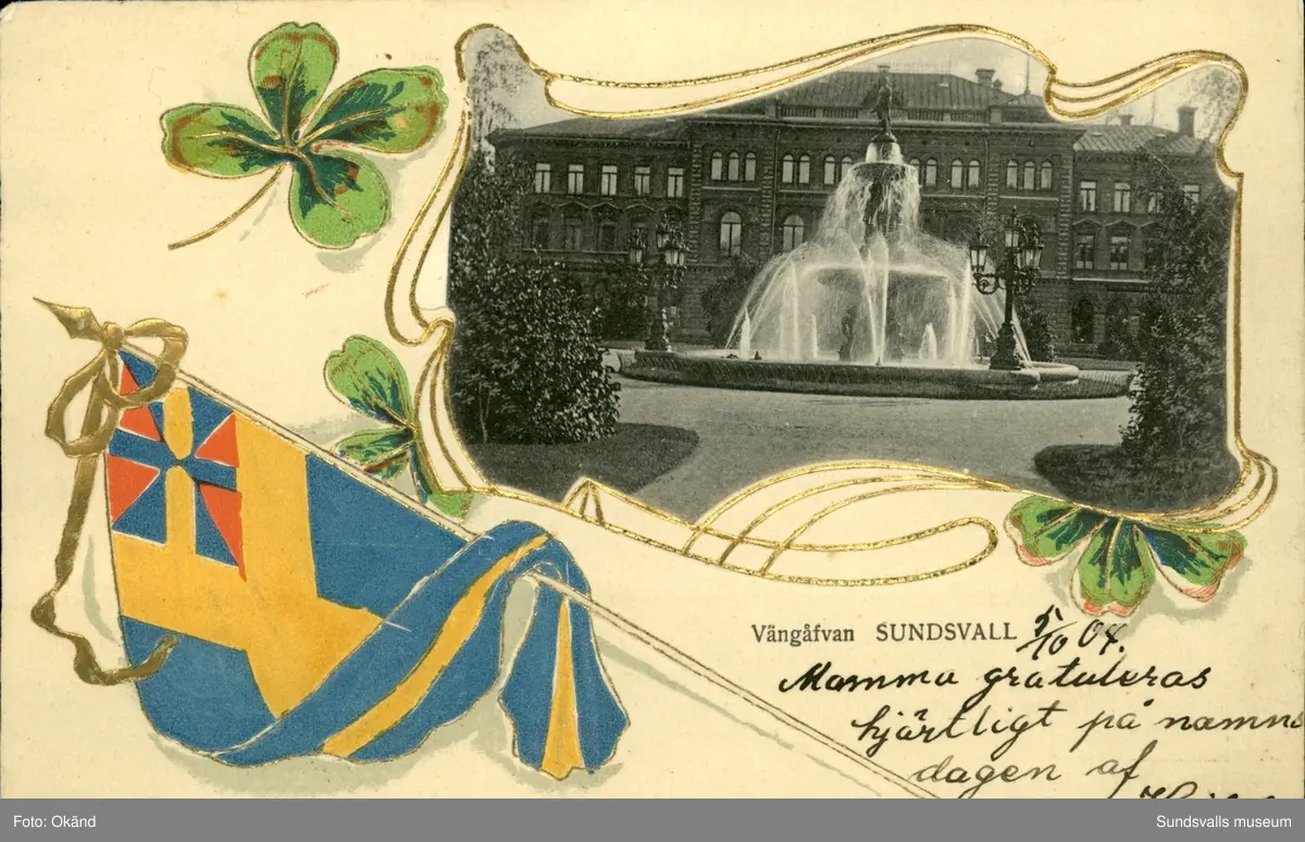 Vykort över fontänen Vängåvan i Sundsvall. Vykortets vänstra övre sida har dekorerats med en fyrklöver och den vänstra nedre av unionsflaggan. I bakgrunden bankhuset.