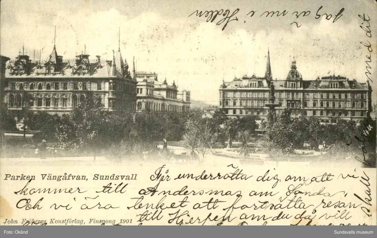 Vykort över Vängåvan, Centralhotellet och Hirschska huset i Sundsvall.