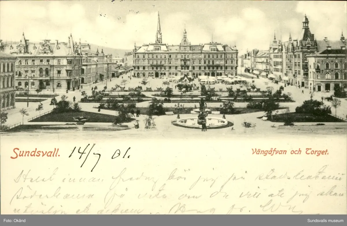 Vykort över Vängåvan och Stora torget i Sundsvall.