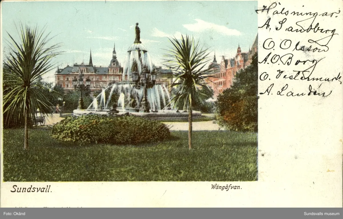 Vykort över Vängåvan i Sundsvall med Hirschska huset i bakgrunden.