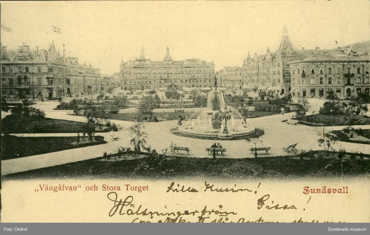 Vykort över Vängåvan i Sundsvall med stenstaden i bakgrunden.