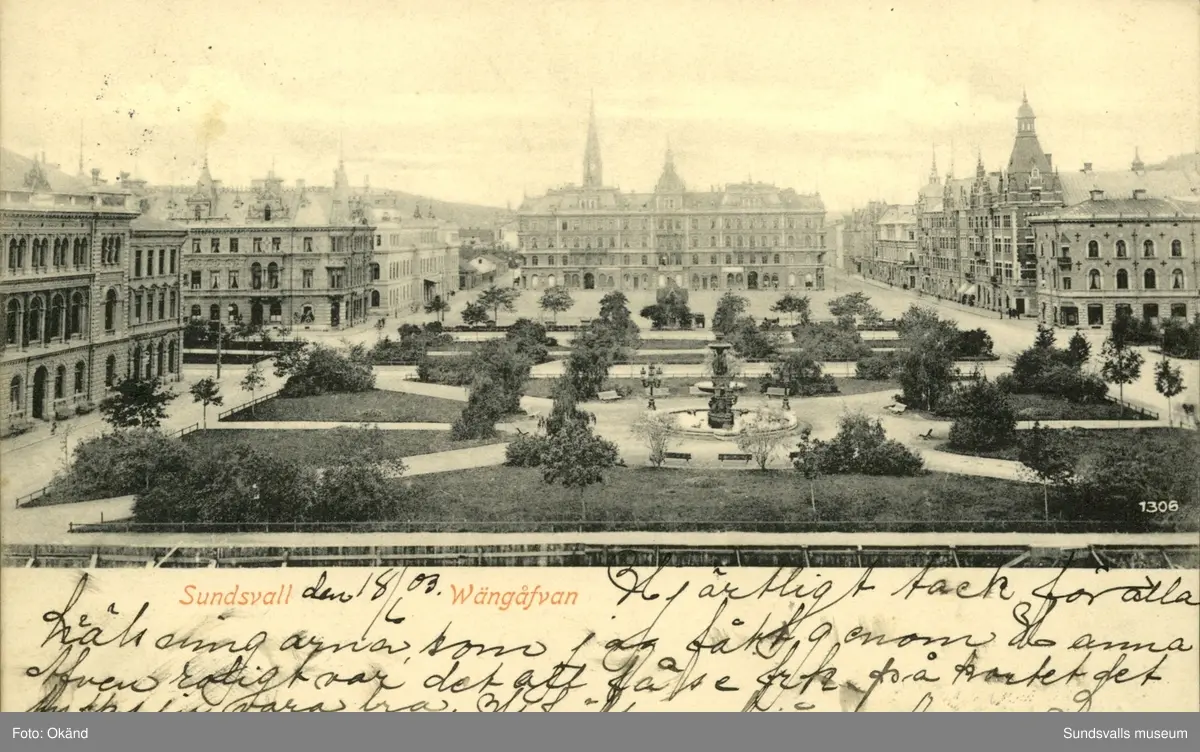 Vykort över Vängåvan och Stora torget i Sundsvall.