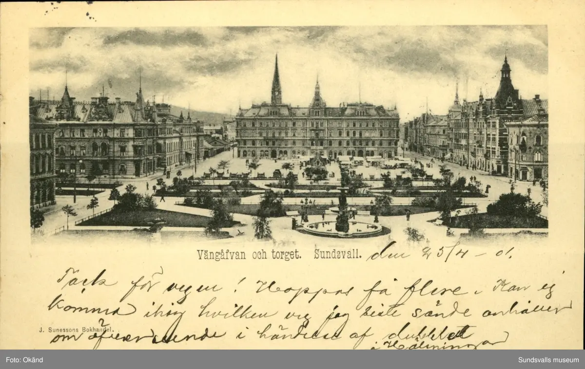 Vykort över Vängåvan och Stora torget i Sundsvall.