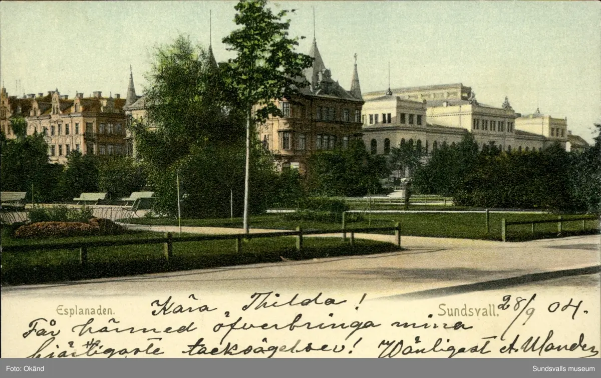 Vykort över Vängåvans park, Hoppets här och Stadshuset i Sundsvall.