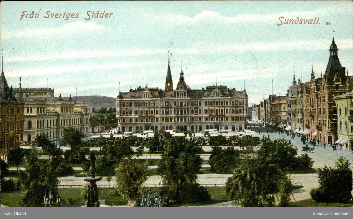 Vykort med motiv över Vängåvan och Stora torget i Sundsvall.