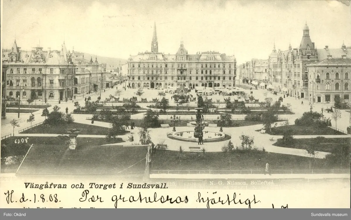 Vykort med motiv över Vängåvan och Stora torget i Sundsvall.