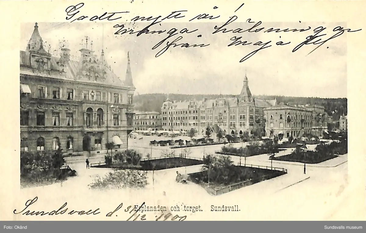Vykort med motiv över Esplanaden och Stora torget i Sundsvall.