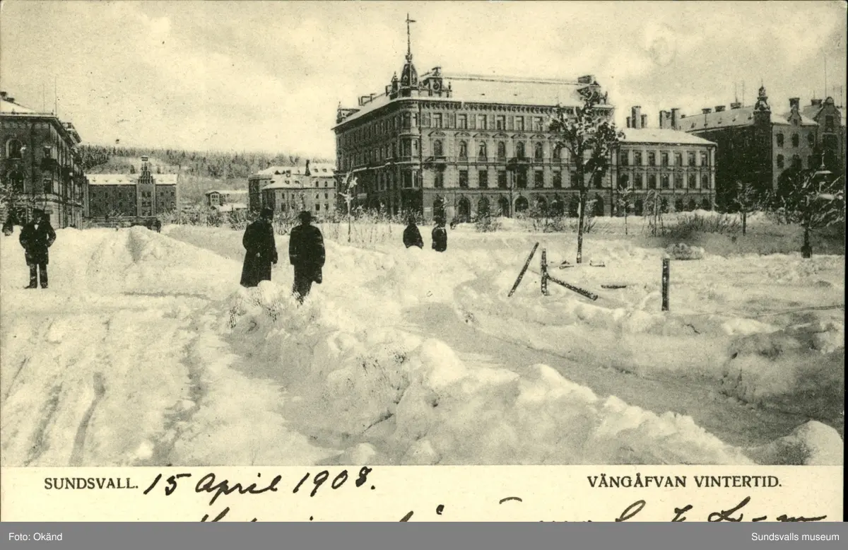 Vykort med vintermotiv över Esplanaden och Vängåvan i Sundsvall.