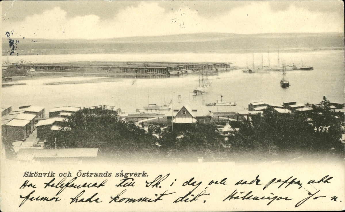 Vykort med motiv över Skönviks och Östrands sågverk.