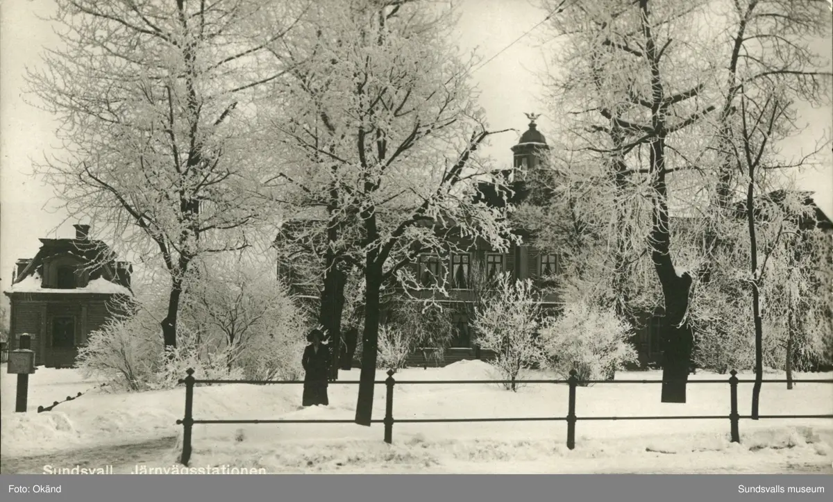 Vykort med vintermotiv över järnvägsstationen i Sundsvall.