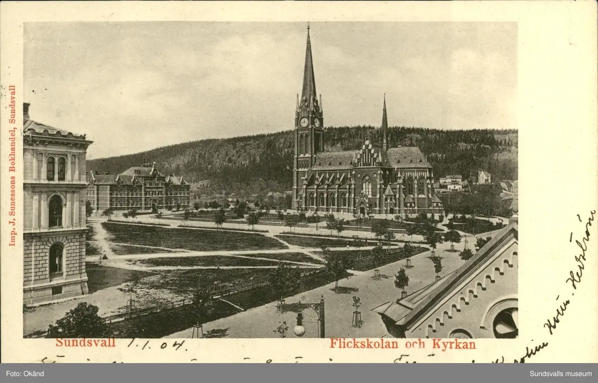 Vykort med motiv över Flickskolan och Gustav Adolfs kyrka.