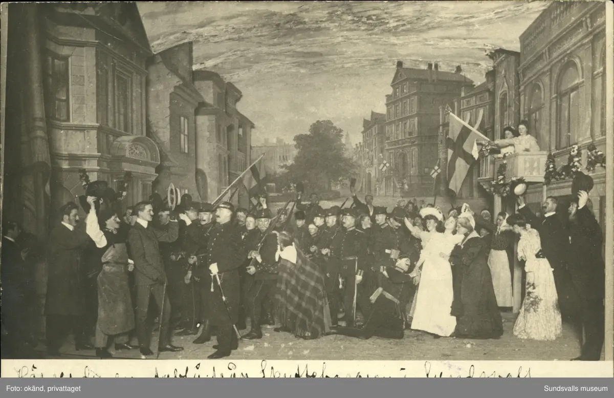 Vykort med motiv över tablån från Skyttebasaren 1905 i Sundsvall.