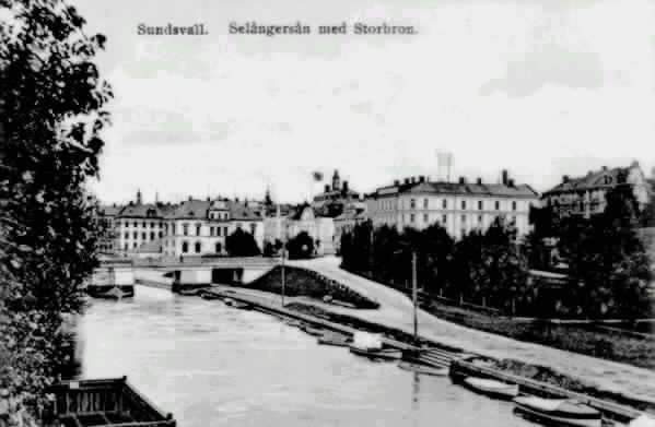 Från vänster Storbron, kv Lyckan 1, kv Penningen 1/Riksbank. I förgrunden Selångersån till vänster vedpråm och till höger båtar. Text till bild " Sundsvall. Selångersån med Storbron."