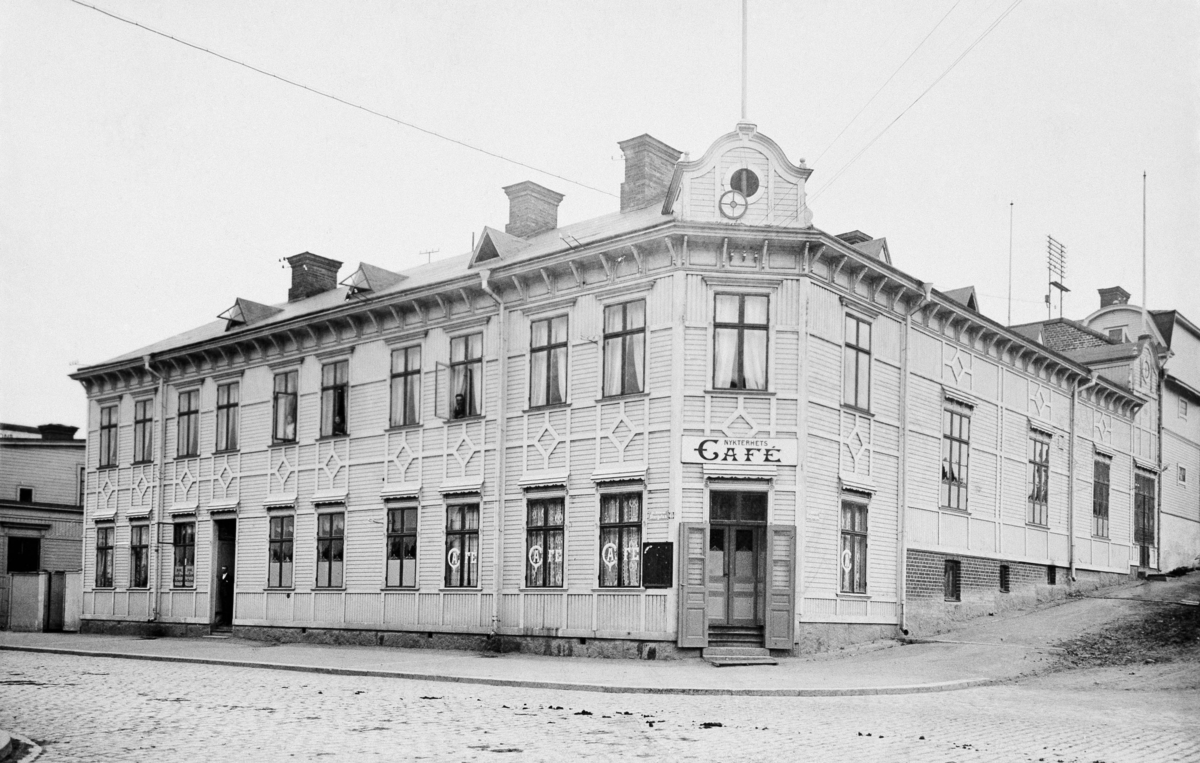 Text som syns på bild "Nykterhets Cafè". Enlig upppgift "125 an", i hörnet Storgatan-Klockgjutargatan (nu Hovrättsbacken).