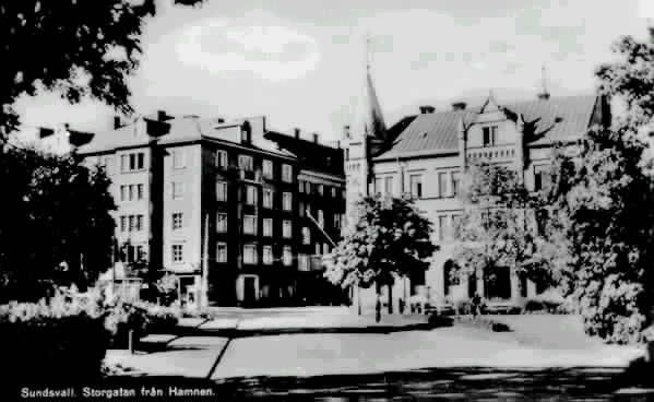Från vänster kv Bacchus 3, Storgatan , kv Mercurius 8-9"/Casselska huset.I förgrunden Järnvägsparken. Text till bild "Sundsvall. Storgatan från Hamnen."