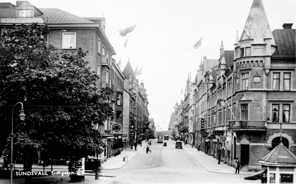 Från vänster kv Bacchus 3B, Storgatan och till höger kv Mercurius. På Storgatan, spårvagn, bilar och fotgängare. Text till bild "SUNDSVALL. Storgatan."