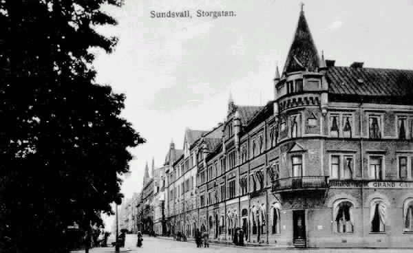 Från höger kv Mercurius 8-9/Casselska huset text på byggnad "GRAND CAFÉ" till vänster Storgatan med fotgängare och en vagn. Text till bild "Sundsvall. Storgatan."
