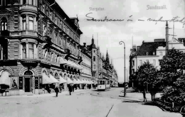 Från vänster kv Olympen 3-4 /Kihlmanska huset, kv Jupiter 4 till höger i bild kv Proserpina 1 /Sundsvalls Handelsbank, Vängåvan. På Storgatan spårvagn och fotgängare. Text till bild "Storgatan. Sundsvall. På kv Olympen syns på bilden text "C A GUSTAFSSON", " WINHANDEL", "SYDFRUKTER", "DELIKATESSER".