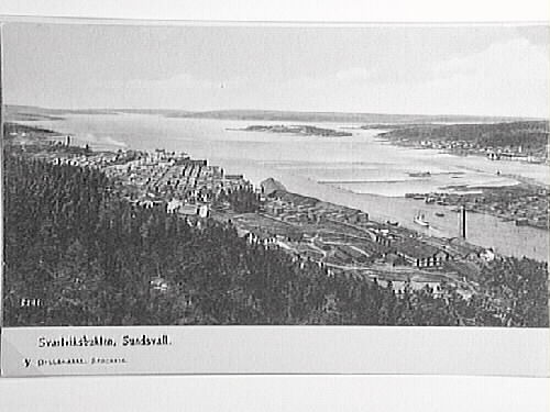 Svartviksbukten med Svartviks nya sågverk i förgrunden och brädgården i bakgrunden. Såverket anlades 1877 - 1878, driften upphörde 1942. Brevkort.