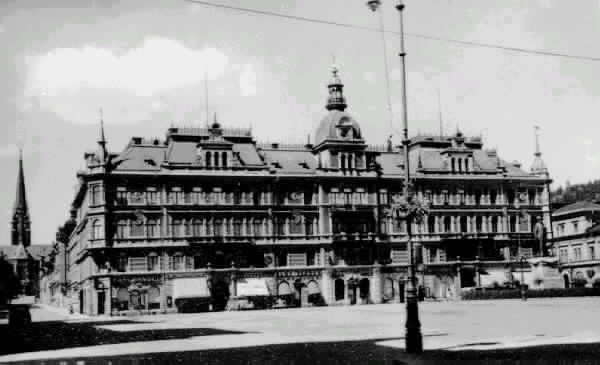 Hirschska huset (kv Nyttan) och Stora torget med Gustav Adolfsstatyn, och till vänster en del av Gustav Adolfskyrkan. Text på vykortet "Sundsvall. Torget."