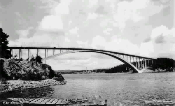 Text på vykortet "SANDÖBRON". Ångermanälven i förgrunden.
