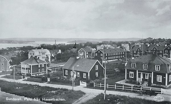 Bostadsbebyggelse på Östermalm med Kaptensgatan i förgrunden. I bakgrunden Sundsvallsfjärden. 2 st vykort. Bildtext till vykorten "Sundsvall. Parti från Hasselbacken."