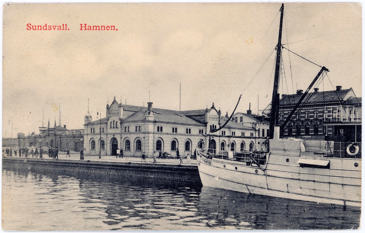 Vy med hamnen och Tullpackhuset. Bildtext till vykort "Sundsvall. Hamnen."