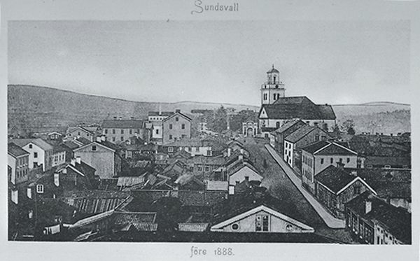 Kyrkogatan med bebyggelse före branden. Längst bort i fonden kyrkan Lovisa Ulrika med tillhörande kyrkogårdsportal. Tryckt text på vykortet "Sundsvall före 1888".