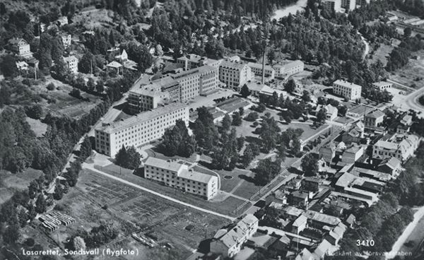 Vy över sjukhusområdet. Bildtext till vykortet "Lasarettet, Sundsvall (flygfoto) 3410 Godkänd av försvarsstaben".