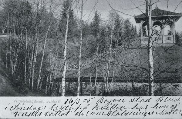 Vattenledningstornet. Vykort med personlig text inklusive ett datum 16/3 05. Tryckt text till vykort "Vattenledningstornet, Sundsvall".