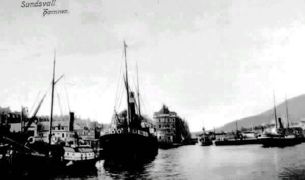 Vy med båtar i hamnen. Bakgrund kv Skonerten och Barkassen. Båten längst till vänster möjligen "Svartvik". Text på vykortet "Sundsvall. Hamnen".