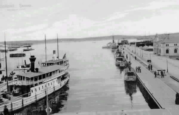 Till vänster i bild ångfartyget "Turisten" till höger Sundsvalls ångbåtskaj och Tullpackhuset. Text på vykortet "Sundsvall. Hamnen. BARDACH FOTO".