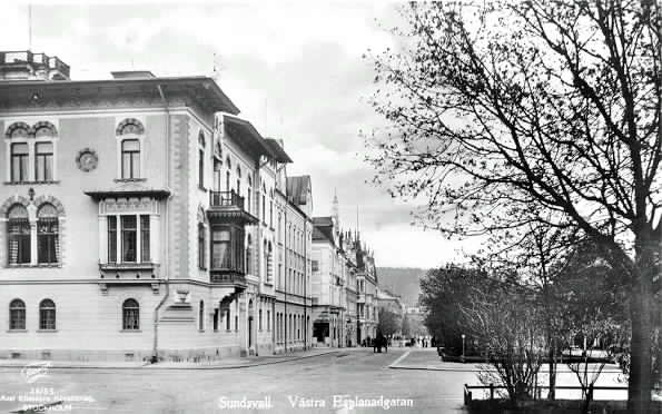 Västra Esplanadgatan Sundsvall. Wikströmska huset till vänster.