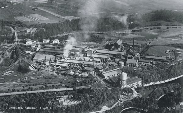 Flygfoto med Ljungaverksfabriken mitt i odlingslandskapet. I förgrunden syns en del av Ljungan. Vykort.