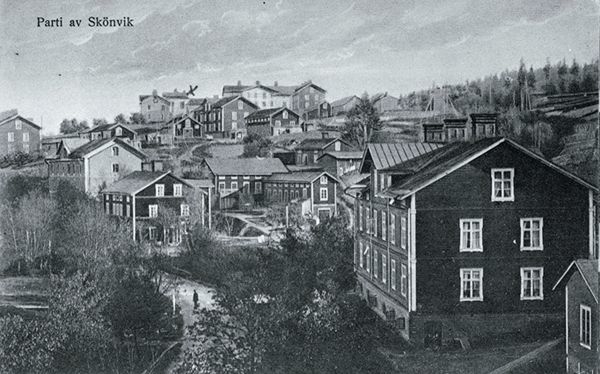 Arbetarbostäder vid Skönviks sågverk. Vykort.