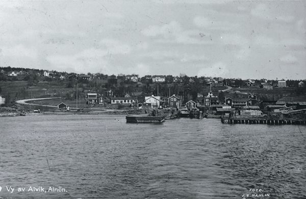 Vy från vattnet mot Alvik, färjeläget, Alnö. Vykort.