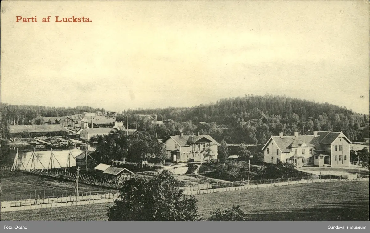 Vykort med motiv över Lucksta, gården Kullen och Sörfors bruk i Attmar.
