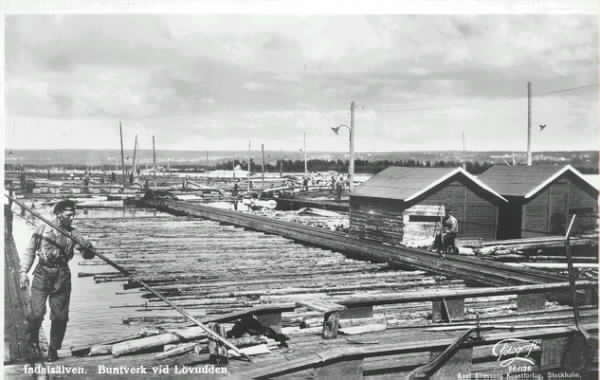 Lövuddens skiljeställe timmerflottning. Vykort.