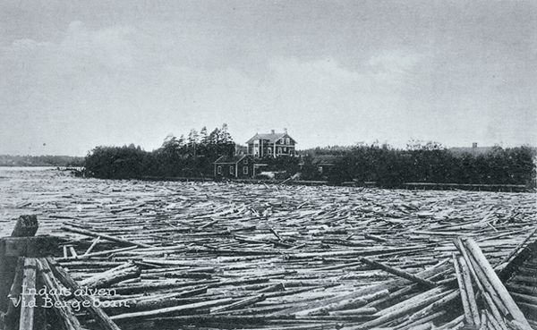 Timmer på Indalsälven, vid Bergebom. Vykort.