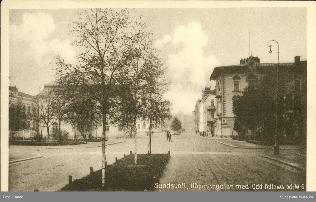 Vykort med motiv över Köpmangatan med Odd Fellow och W-6 i Sundsvall.