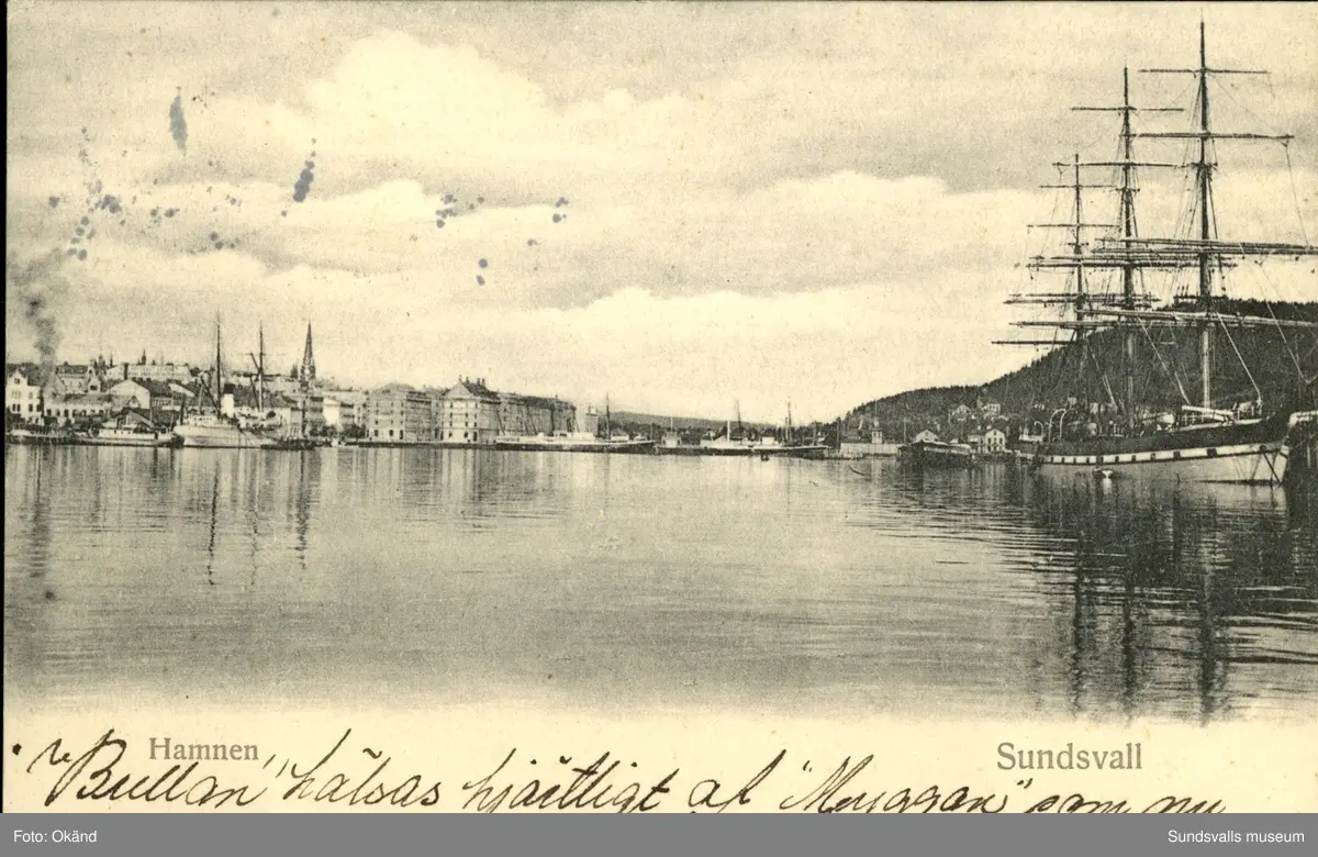 Vykort med motiv över hamnen i Sundsvall.