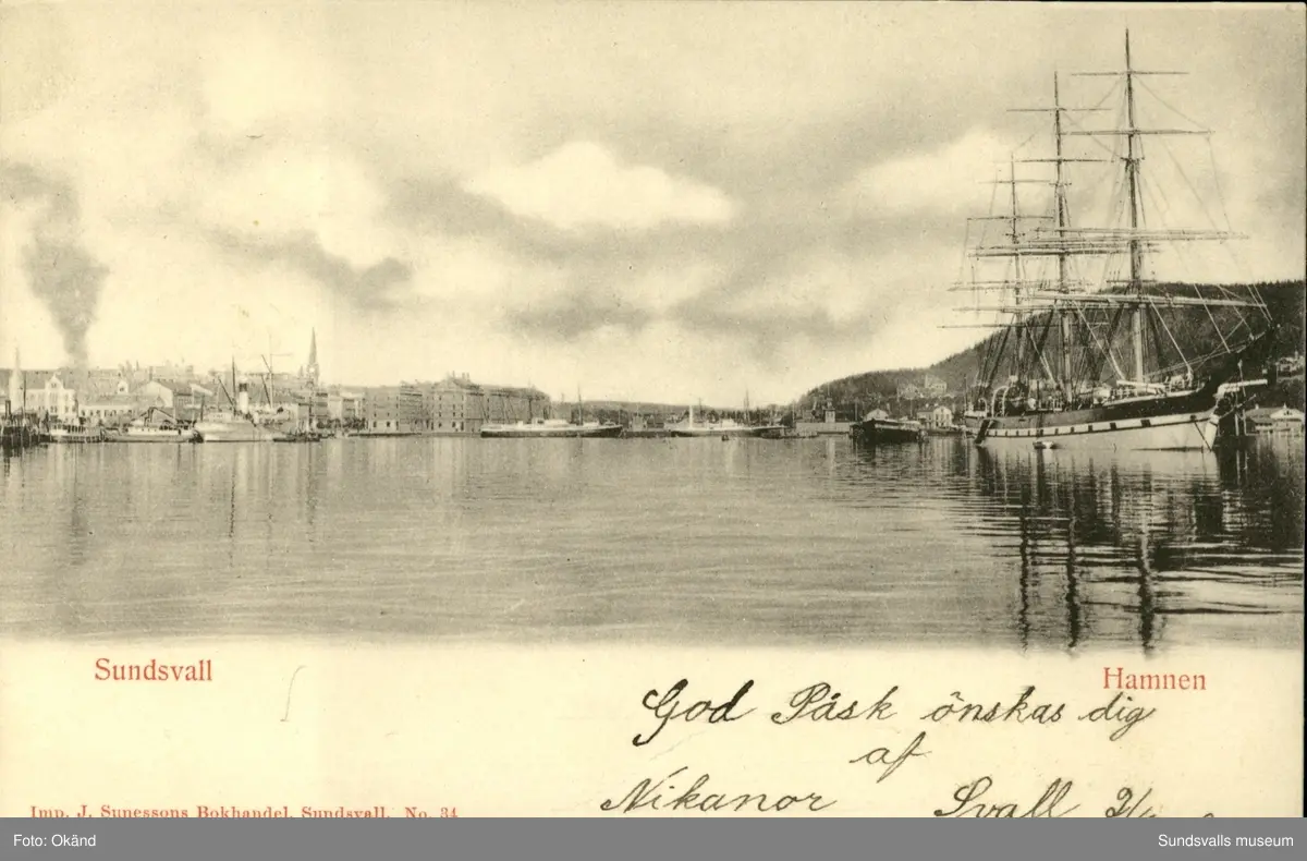 Vykort med motiv över hamnen i Sundsvall.