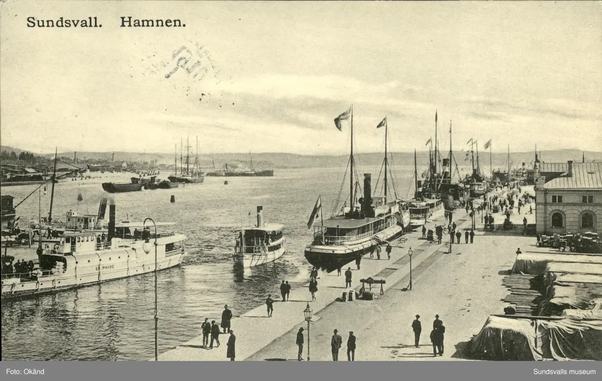 Vykort med motiv över passagerarbåtar vid hamnen i Sundsvall.