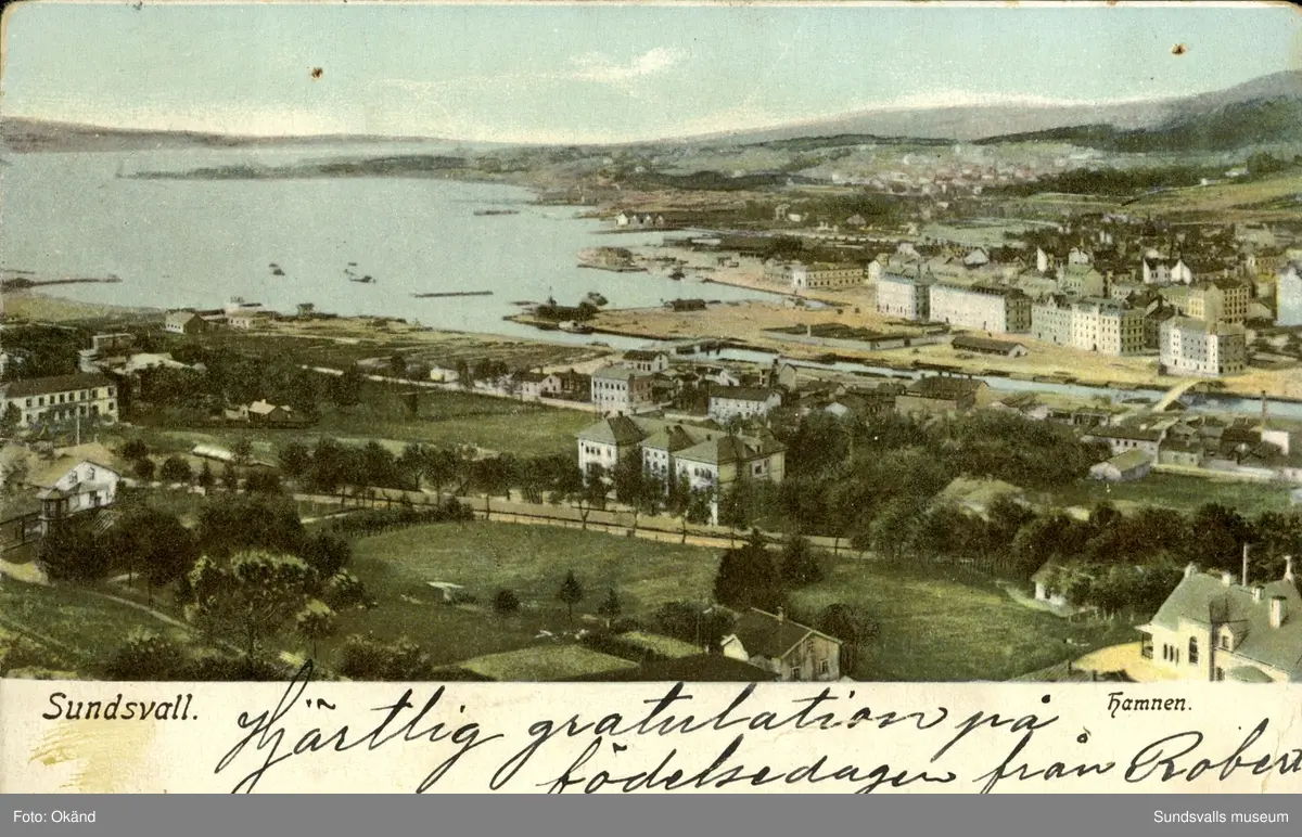 Titel: Vykort med motiv över hamnen i Sundsvall.