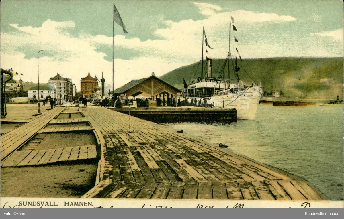 Vykort med motiv över hamnen och passagerarbåtarna i Sundsvall.