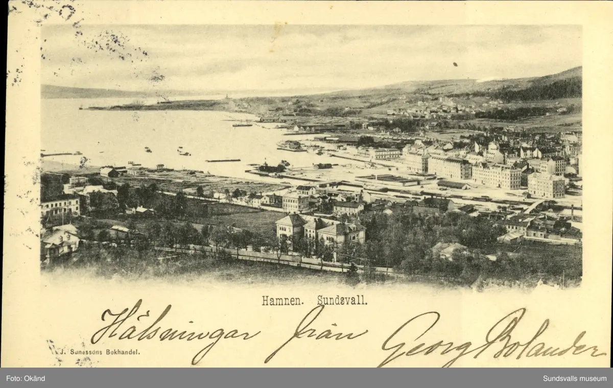 Vykort med motiv över hamnen i Sundsvall.