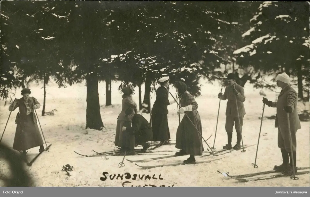 Vykort med motiv över ett sällskap av män och kvinnor som ska åka skidor.
