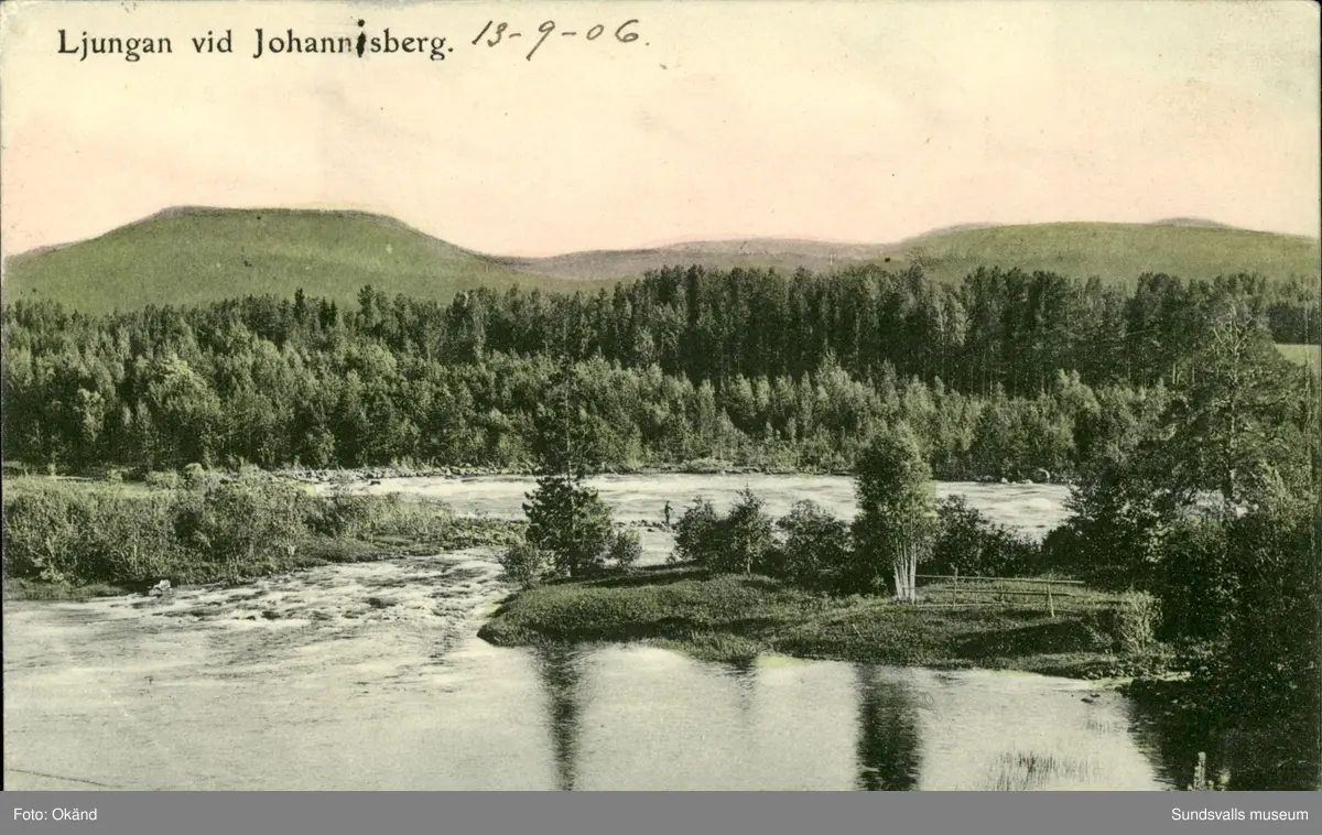 Vykort med motiv över Ljungan och halvön Paradiset vid Johannisberg.